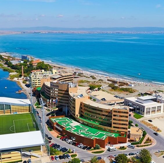 Хотелът е разположен между бреговете на Соленото поморийско езеро и Черно море и представлява уникална комбинация от хотелски комплекс, лечебно-възстановителен и уелнес център, футболен стадион и спортна зала.